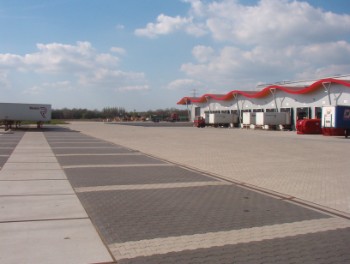 | |  | In en uitritten voor auto's en vrachtwagens met elektrische slagbomen. | | Parkeerterrein van H-klinkers met waterafvoergoot. |